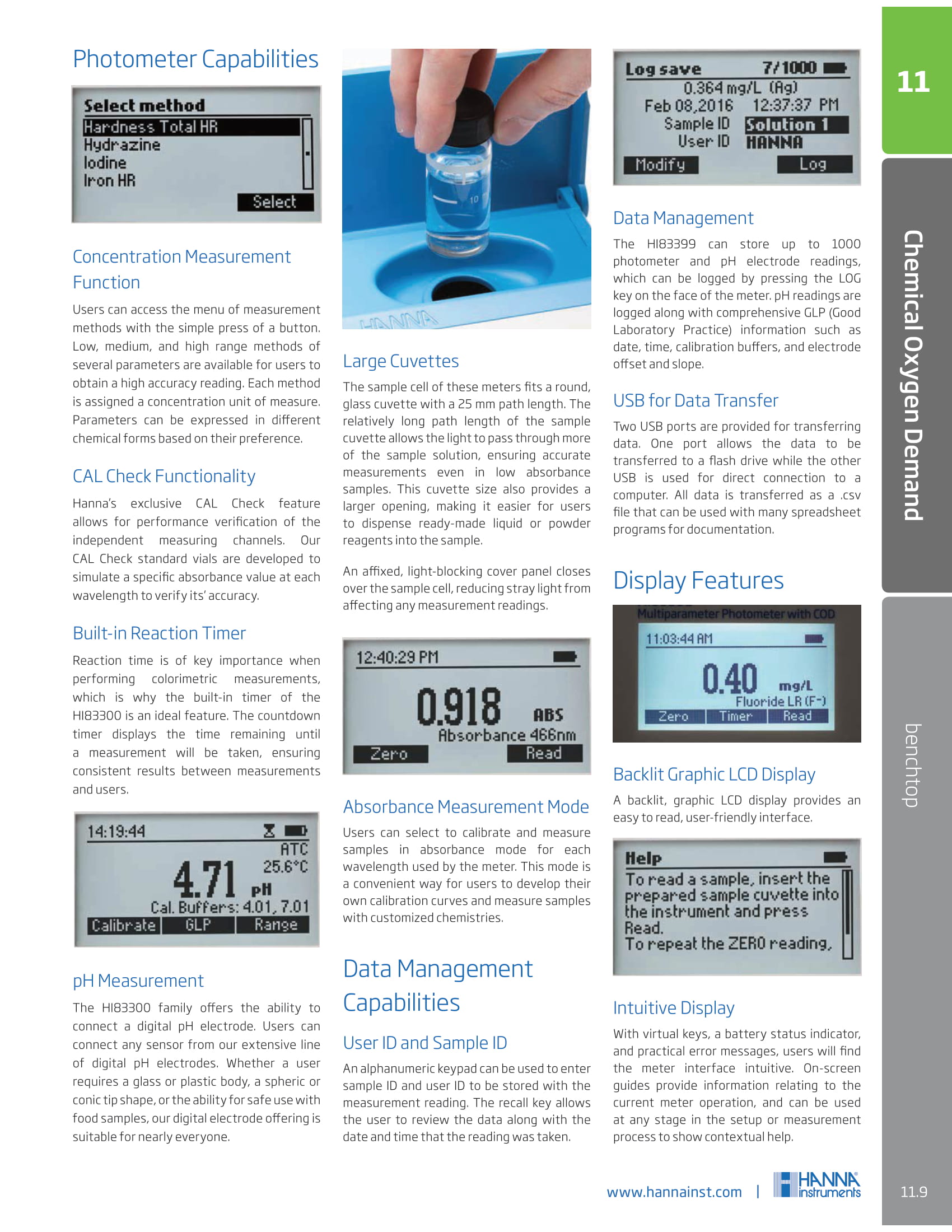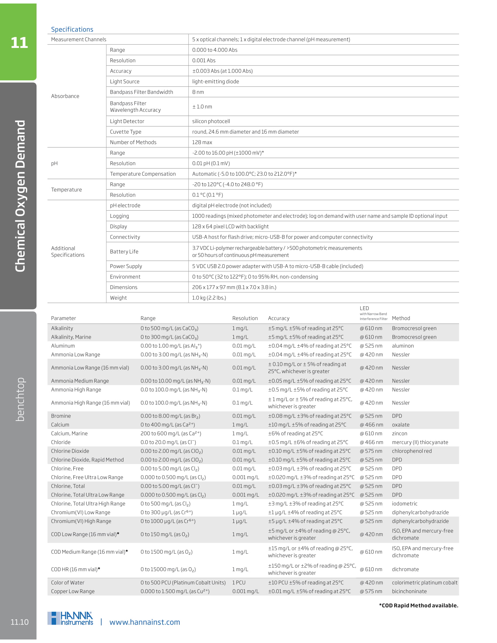 6. สามารถวิเคราะห์ด้วยวิธีการดูดกลืนแสงได้ 500 ครั้งนานต่อเนื่อง หรือ 50 ชั่วโมงสำหรับการวัดค่าความเป็นกรด-ด่าง (หัววัดวัดค่า pH ต้องซื้อแยก)