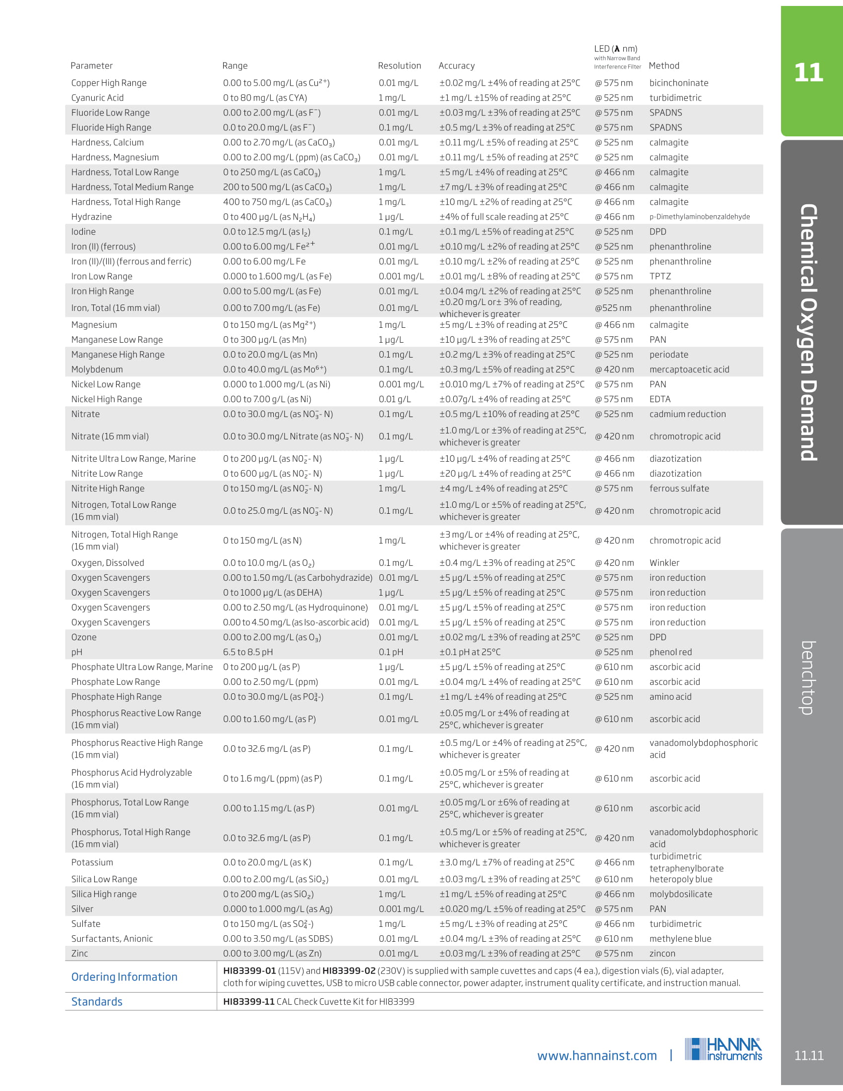 หมายเหตุ การวิเคราะห์แต่ละพารามิเตอร์จะประกอบไปด้วยสารเคมีสำหรับทดสอบสำหรับพารามิเตอร์นั้นๆ ตามมาตรฐานของ Standard Method และ USEPA Method ที่ยอมรับใช้กันทั่วโลก โดยทำการสั่งซื้อจะแยกต่างหาก ในแต่ละพารามิเตอร์ที่ต้องการวิเคราะห์